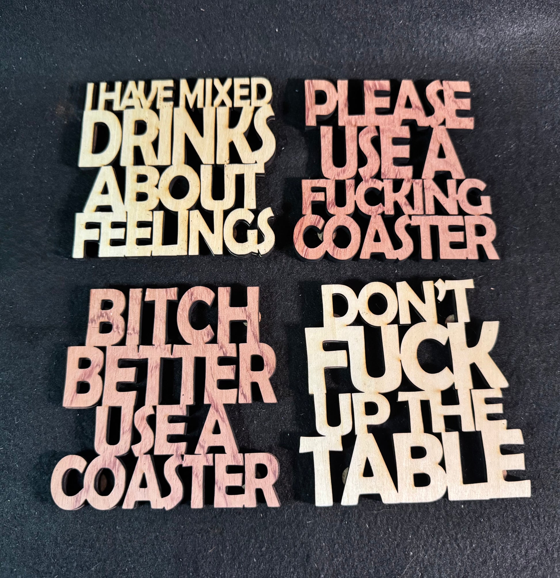 A set of 4 solid wood coasters featuring laser-cut funny sayings.