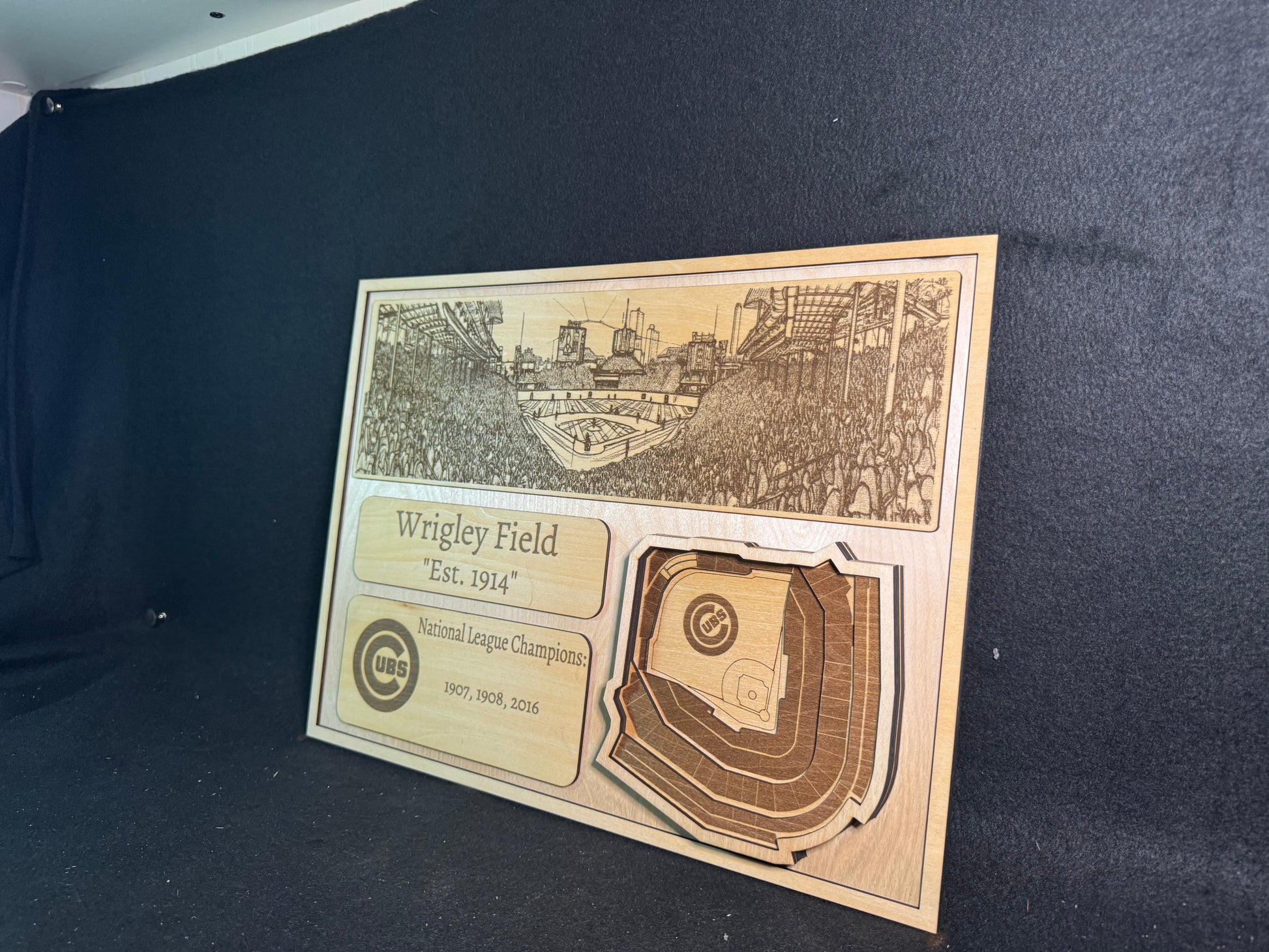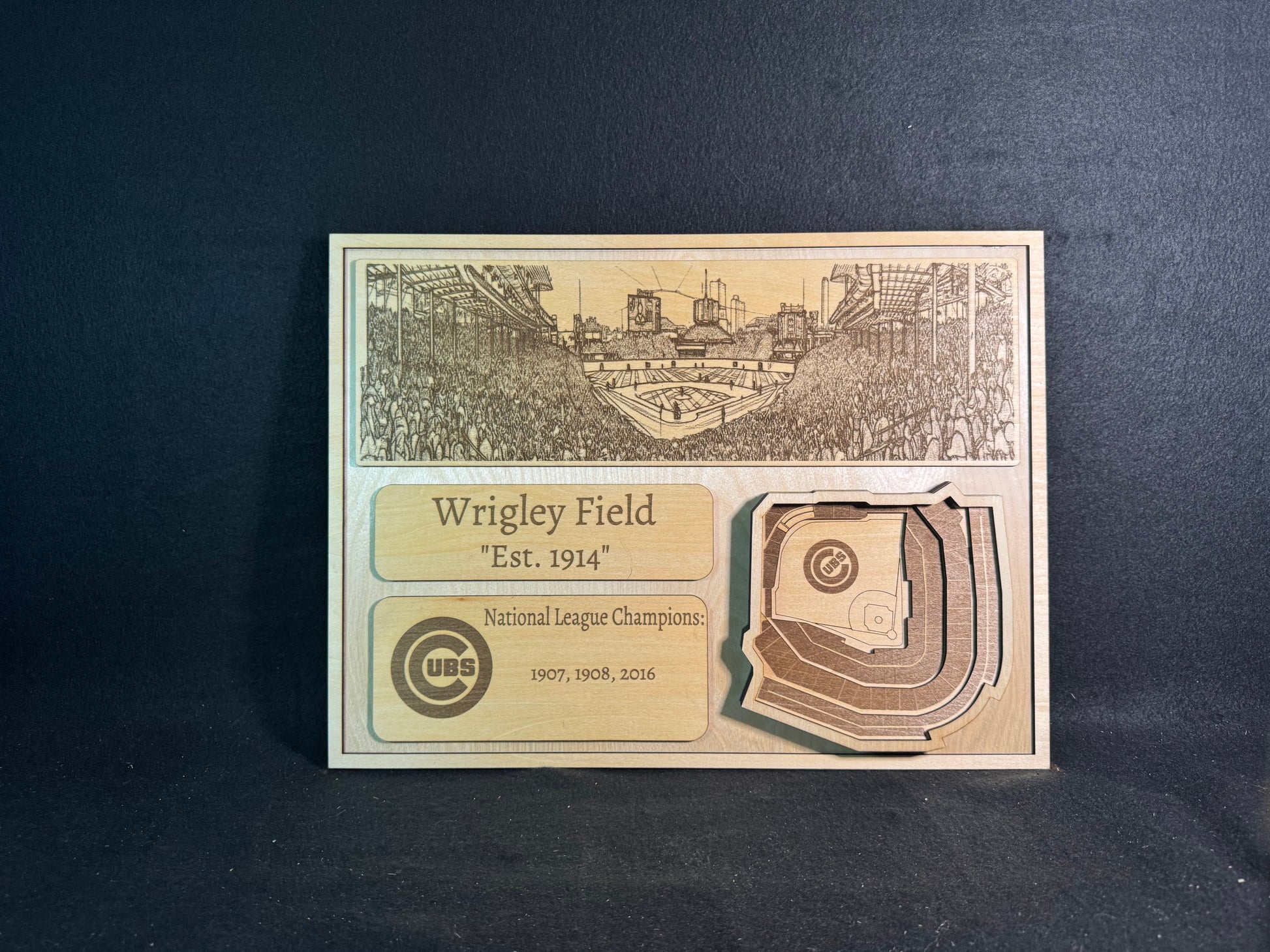 This handcrafted 3D layered wood piece captures the architecture, history, and energy of Wrigley Field — designed for fans who want more than a poster.